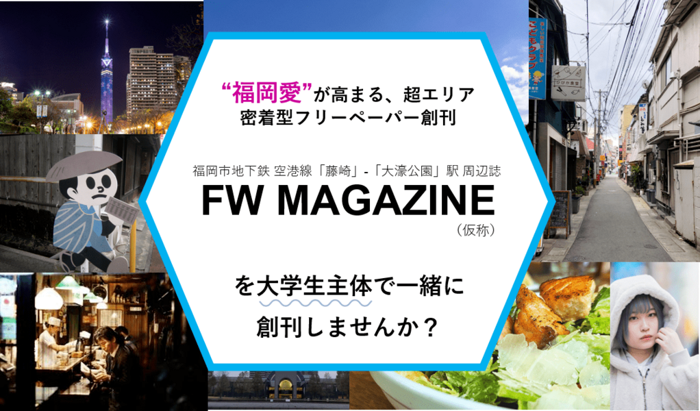 福岡市地下鉄 空港線「藤崎」-「大濠公園」駅周辺の居住者を対象とした、超エリア密着型フリーペーパー「FW MAGAZINE」を創刊。本プロジェクトは産学民連携したプロジェクトとして、学生主体で開催。