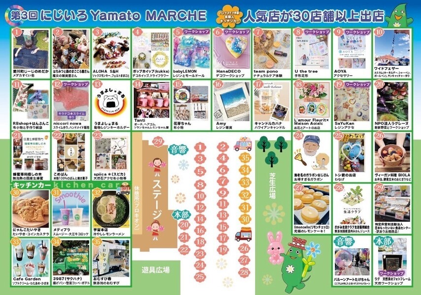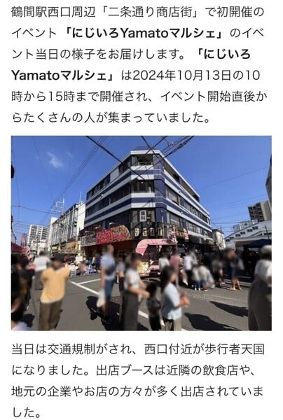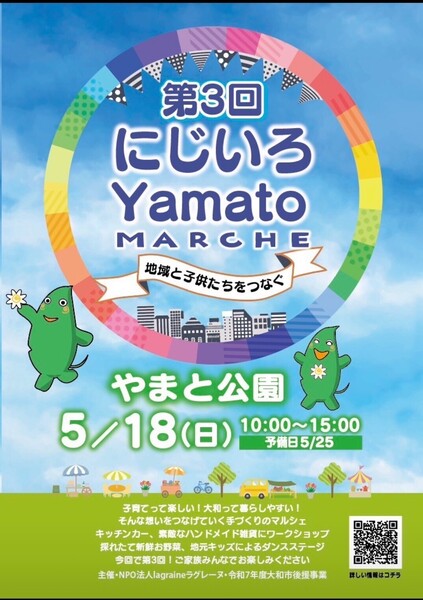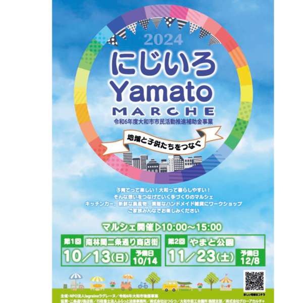 2024年に第一回を開催し、既存の商店が出店されちびっ子ダンスやキッチンカーを呼ぶ事で1000人を超える来場者に大盛況に終わりました。このマルシェは大和市内の公園でも開催し、こちらは子どもと地域がつながるようにがコンセプトに800人が来場しました。出店費用の運用は公園管理への支払いと歩行者天国の警備員の配置にかかり、全てのスタッフがボランティアで回しております。