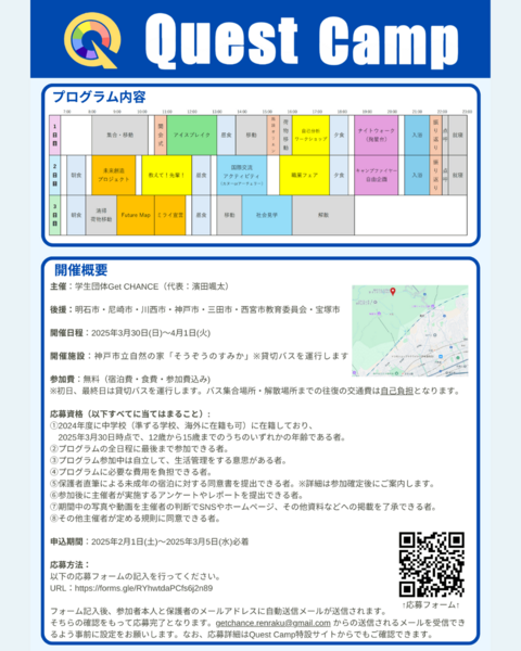 - 【中学生対象】Quest Campー君の未来を切り拓け!(2泊3日・参加費無料)