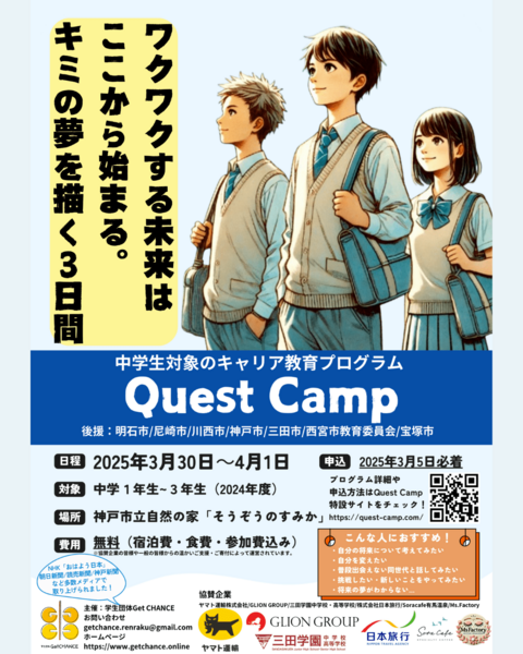 【中学生対象】Quest Campー君の未来を切り拓け!(2泊3日・参加費無料)