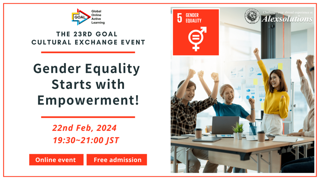 オンライン国際交流会で、「SDGs9:ジェンダー平等を実現しよう」について、国境を越えて英語でディスカッションしてみませんか?日本人研修生による英語のプレゼンもご覧になれます。