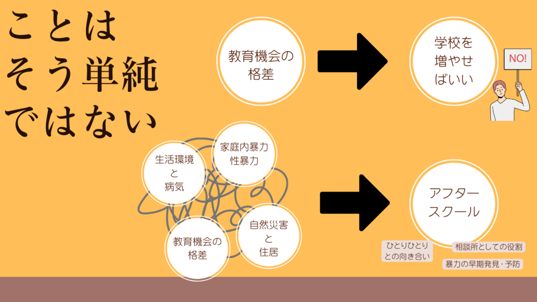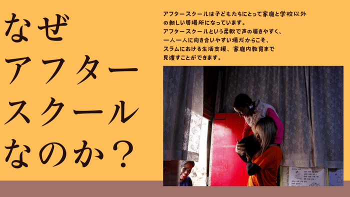 なぜ学校ではなくアフタースクールなのか?それには、スラムという地域の生活環境が深く関わっています。教育の機会が足りないから学校を増やせばいい!先生がいないから増員すればいい!と言うわけではありません。スラムと呼ばれる場所で生活する子どもたちは、常に災害や暴力と隣り合わせの生活をしています。