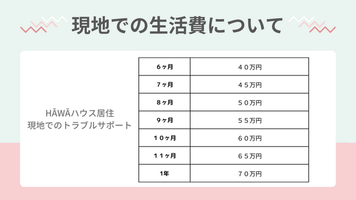 現地での生活費、トラブルや体調不良時などのサポートにかかる費用は以下のとおりです。以下の費用にはHĀWĀ houseの宿泊費、その他サポート費用が含まれています。