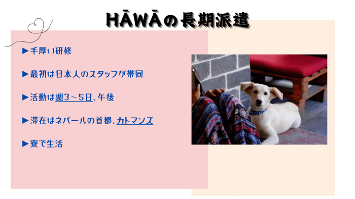8月スタートで申し込まれた場合、最初の2ヶ月はHĀWĀのスタッフが帯同します。現地での様々な案内やワークショップなどを行います。