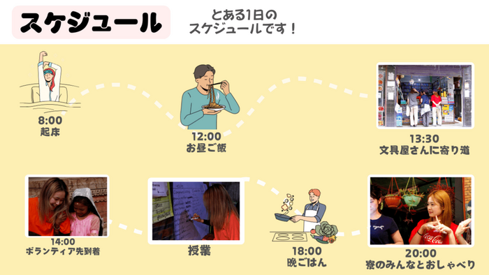 基本的に、ご自身でスケジュールを組んでいただくことができます。現地ではバイクタクシーやバスを使って移動ができます。活動がない日は様々な場所に行ってみてください。