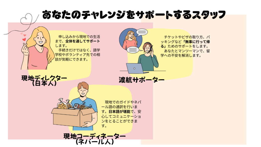 HĀWĀでは、経験豊富なスタッフがあなたの挑戦をサポートします!現地でのサポートはもちろん、事前の手厚い研修、ビザやチケットなど総合的にサポートします。現地での体調不良なども、信頼のある病院と通訳を手配し、迅速にサポートいたします。