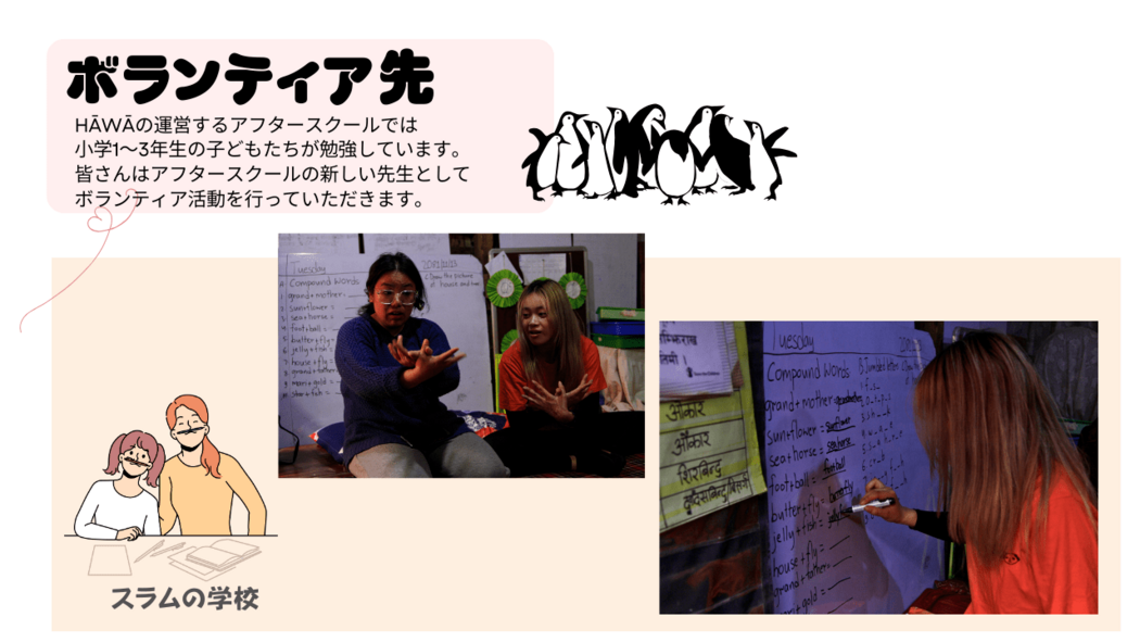 HĀWĀは国内外でボランティアプログラムを展開し、年間100人以上のボランティアを受け入れています。ただの活動で終わりにするのではなく、学びの言語化、深掘り、そして子どもたちへの影響も一緒に考えながら活動することができます。