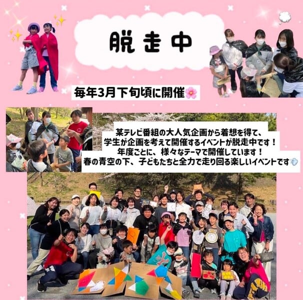 →3ヶ月に1回学生自らが作るイベント(例 ウォークラリー、クリスマスマーケット、逃走中のパロディ企画、キャンプ(宿泊))