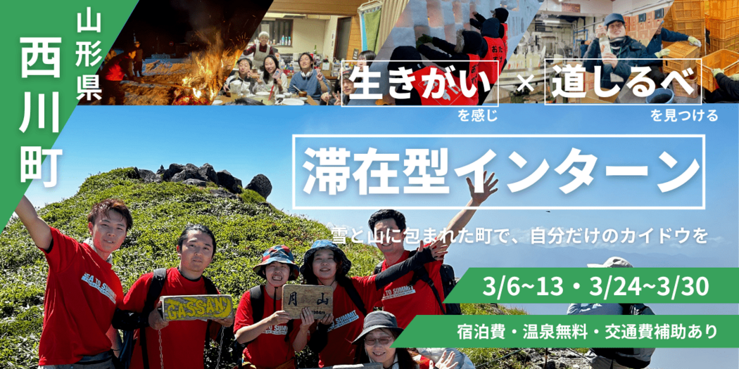 「このままでいいのか?」そんな問いを抱えるあなたへ。山形県西川町で、働き、暮らし、地域と交わる7日間。企業での仕事、町民との対話、文化や信仰に触れながら、自分だけの“生きがい”の道しるべを感じよう。