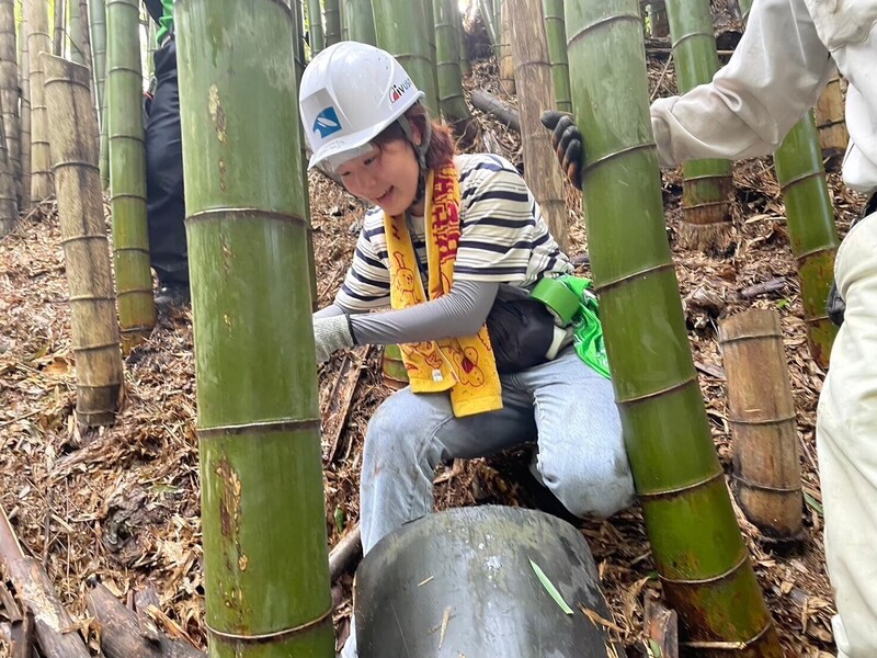 今回の活動では、竹林整備活動と一緒に活動した大学生・地元高校生・地元NPOや住民との交流会のみですが、竹の資源活用のために遊具を作ったり、幼竹からメンマを作る活動なども行っています。