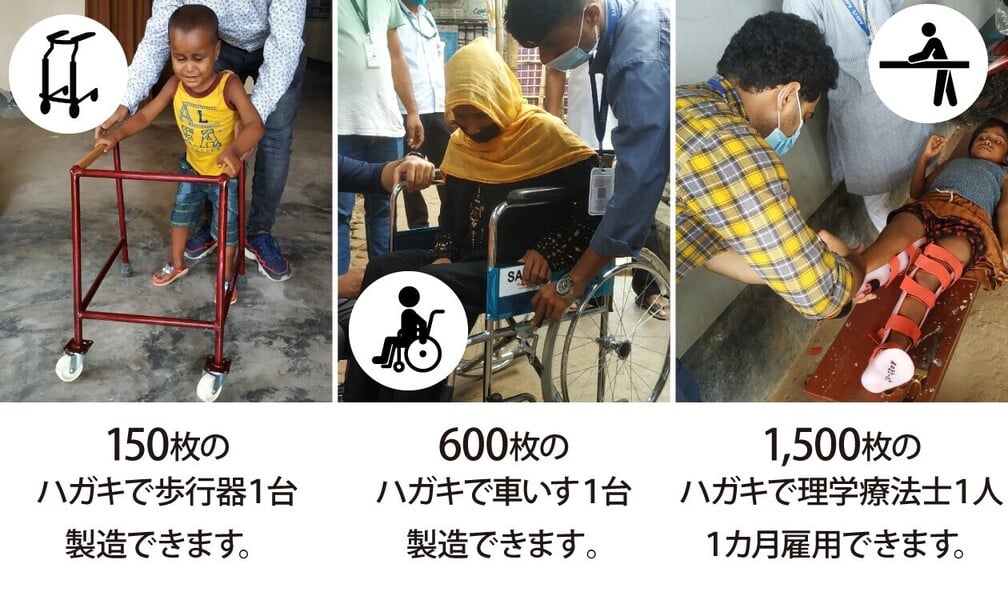 AAR Japanは、バングラデシュの現地団体とともに難民の障がい者200人を支援するプロジェクトを実施。書き損じハガキや未使用の切手で、バングラデシュの難民の障がい者に車いすなどの補助具を届けます。