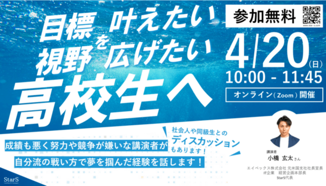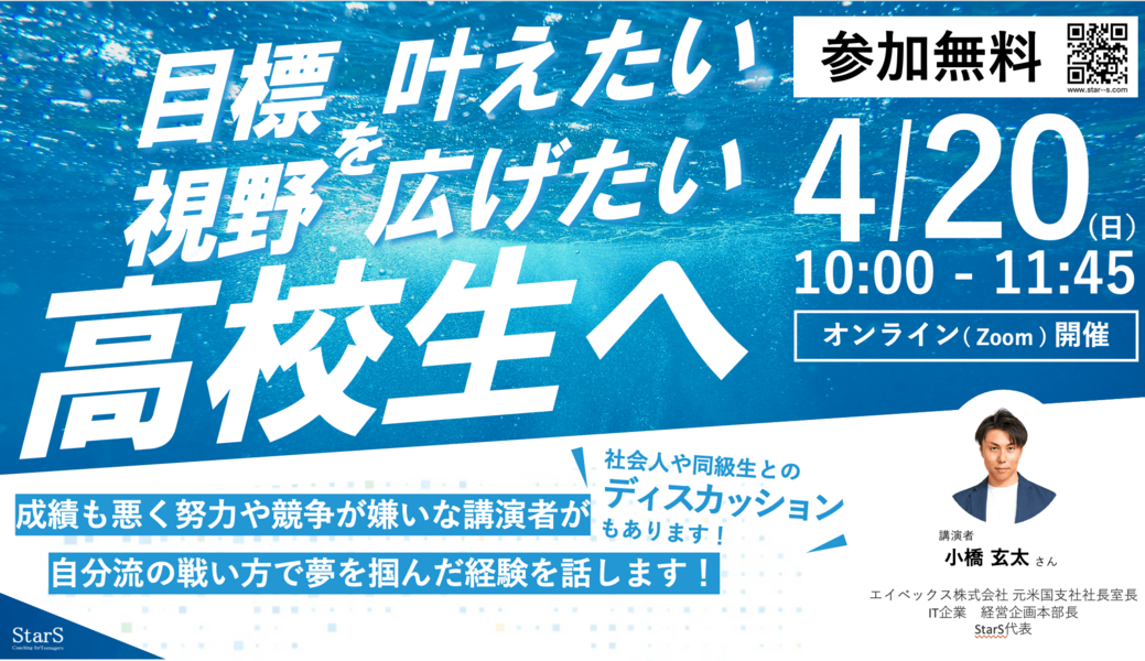 社会人の"決断"から視野を広げる!高校生対象オンラインイベント「StarS」を開催いたします!社会人のこれまでの人生の"決断"を題材にし、ディスカッションを通じて、高校生のみんなの選択肢や視野を広げ、夢・目標を叶える力をつけるプログラムです!
