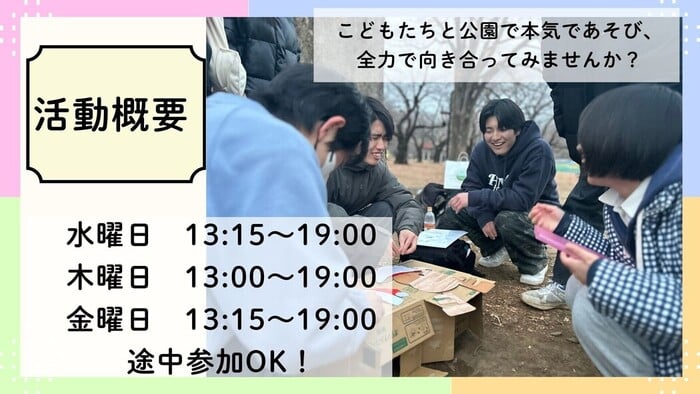 活動頻度:週1回からOK 活動時間:13:00~18:00(途中参加も可能!) |