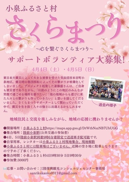 - 気仙沼市小泉ふるさと村さくら祭りプチコンサートサポートボランティア大募集