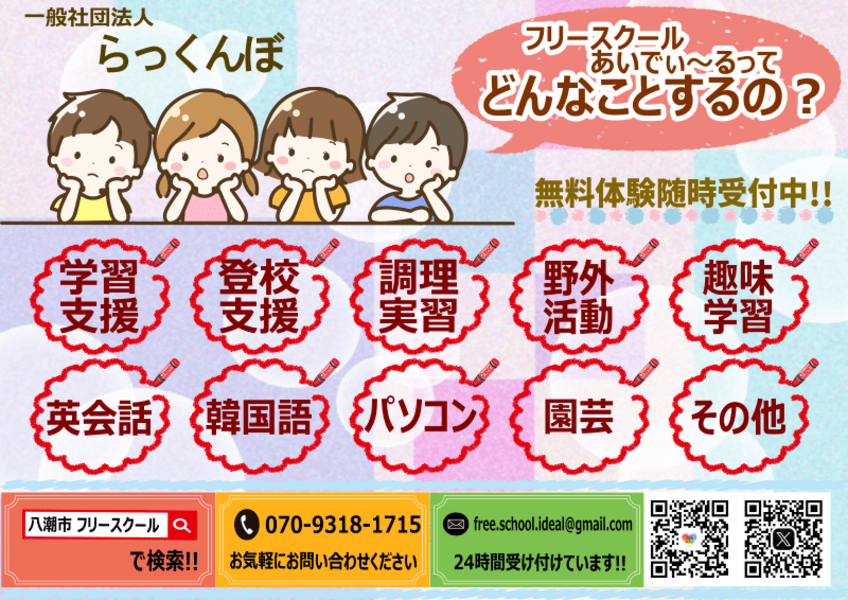 埼玉県八潮市にあるフリースクールです。不登校児童の安心して過ごせて学べる居場所を目指しているアットホームな環境です。年齢や性別は問いません。子供たちが沢山の方と過ごせると良いです。