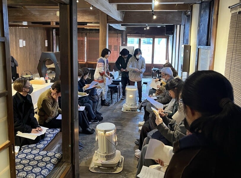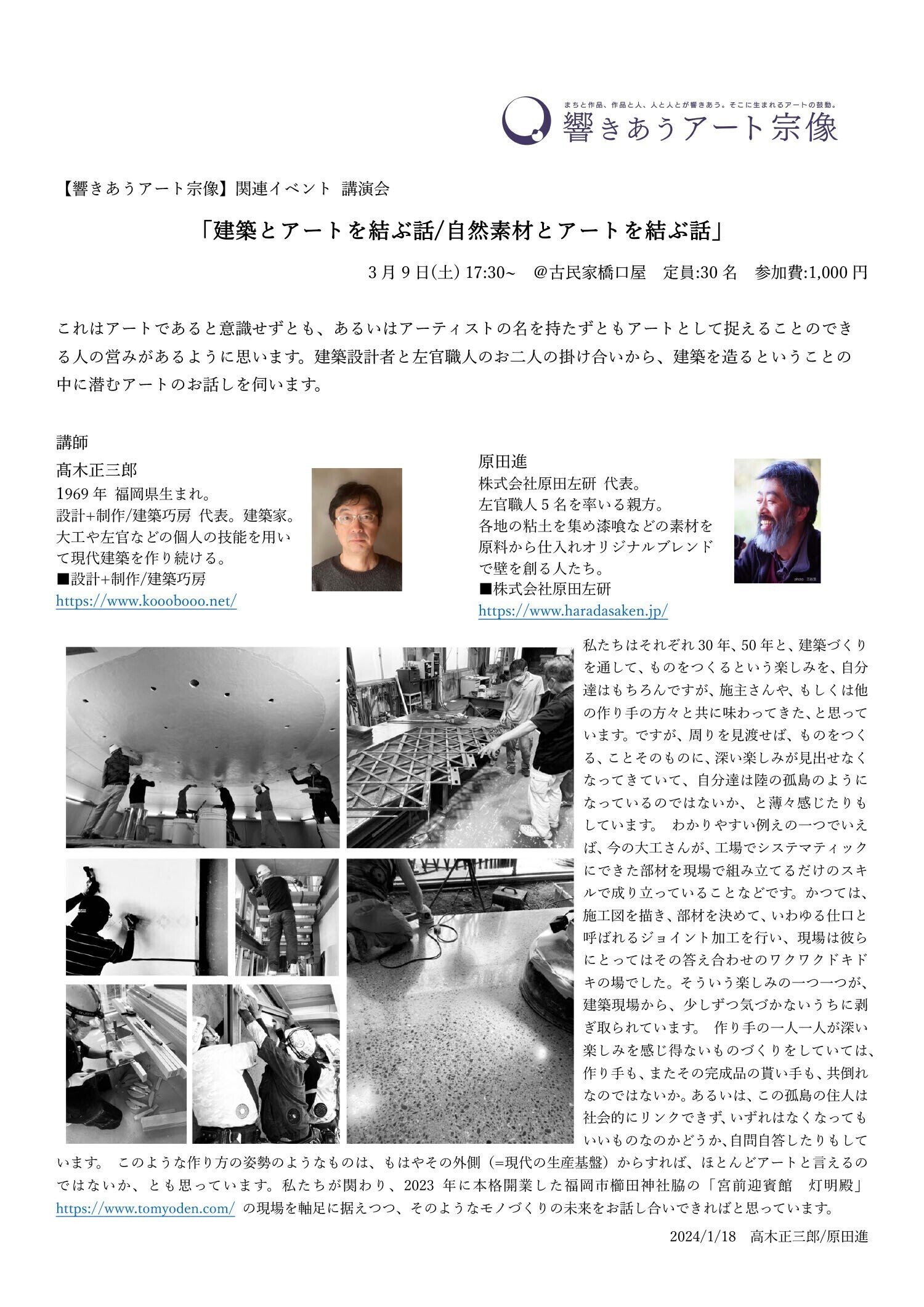 【会場】赤間宿 古民家橋口屋 【講師】髙木正三郎・原田進 "建築設計者"と"左官職人"の掛け合いから、建築を造るということの中に潜むアートの話を伺う。