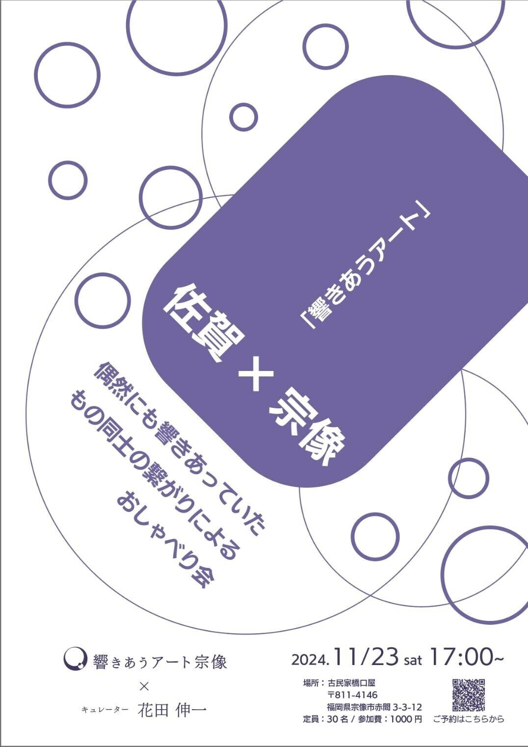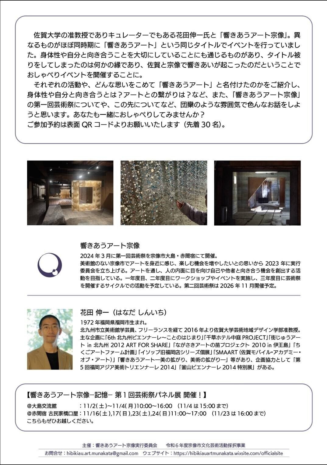 偶然にもほぼ同時期に「響きあうアート」という同じタイトルでイベントを行っていた佐賀大准教授&キュレーター花田伸一さん。そのご縁から名付けた思い、「自分と向き合うとは?」「アートとの繋がりは?」この先についてなど、団欒のような雰囲気でのおしゃべり会。
