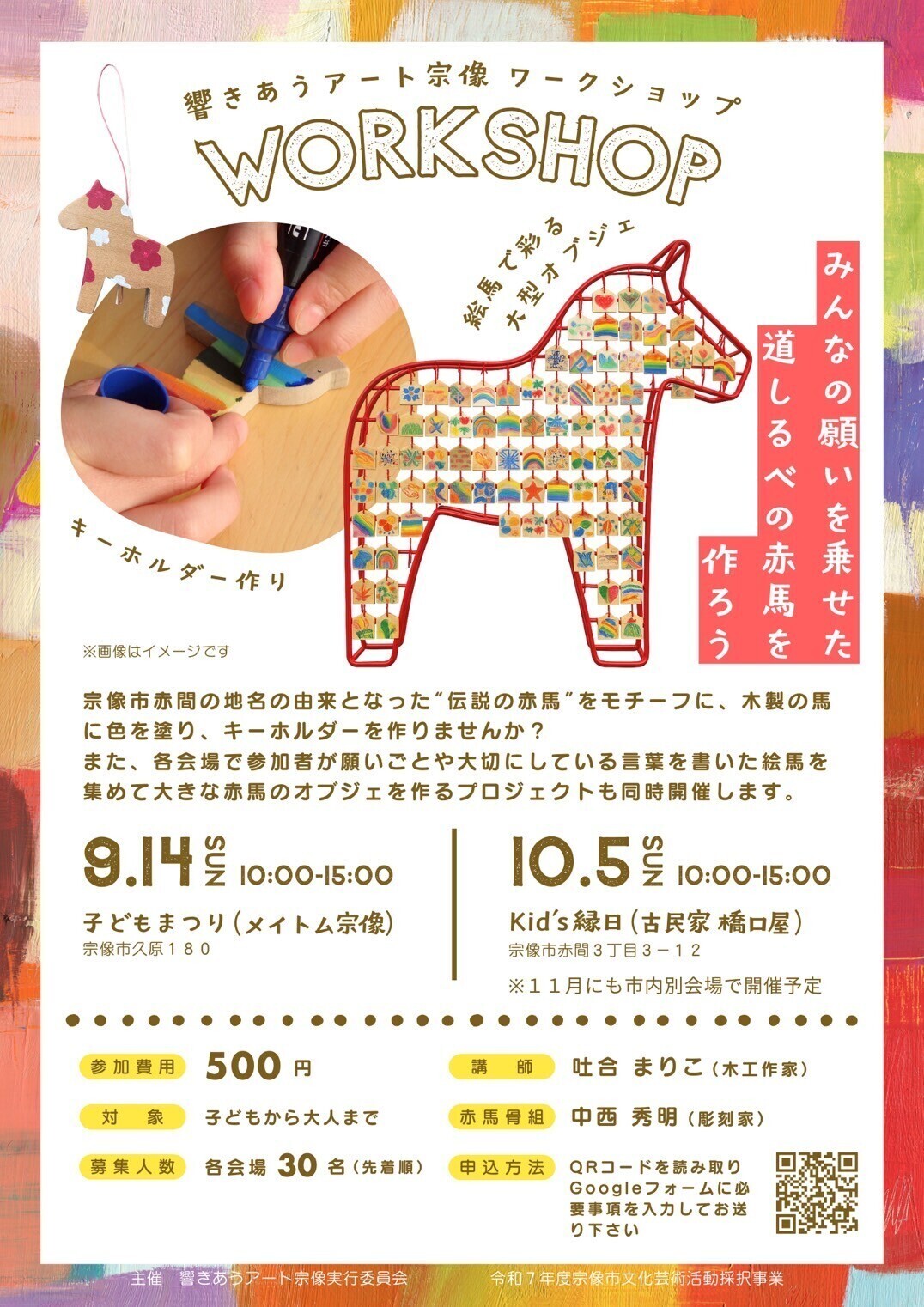 【内容】宗像市赤間の地名の由来となった“伝説の赤馬”をモチーフに、みんなの願い(絵馬)を乗せた道しるべの赤馬を作るワークショップ。