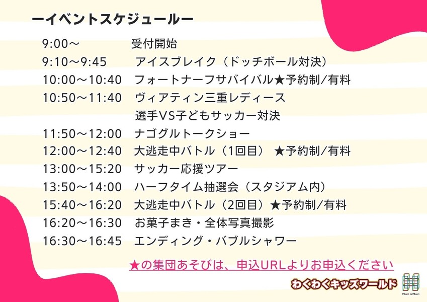 このイベントは、ヴィアティン三重レディース開幕戦の応援および、小学生を対象とした集団遊び、常設遊びエリア、マルシェやキッチンカーを楽しめるイベントです。子ども達の笑顔をつくるスタッフを募集しています。