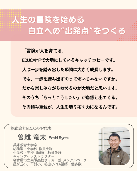 そんな社会に対してEDUCAMPは、心に一歩を踏み出す瞬間を通じて、「自分には挑戦する力がある」と思える人を一人でも多く増やしていきます。