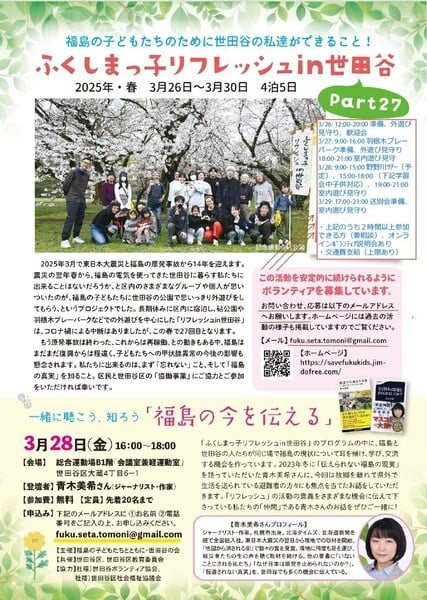 (任意団体)「福島の子どもたちとともに・世田谷の会」この募集の受入団体「(任意団体)「福島の子どもたちとともに・世田谷の会」」をフォローして、