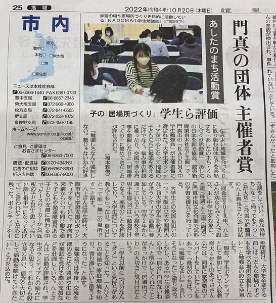 2018年10月門真市出身の大学生らが手弁当でスタート。全13大学31名の大学生が参加、大学生有志らが運営・企画をする市内中学生を対象にした居場所・学習支援です。2025年度大学生ボランティア募集!!