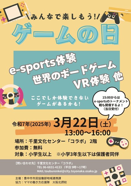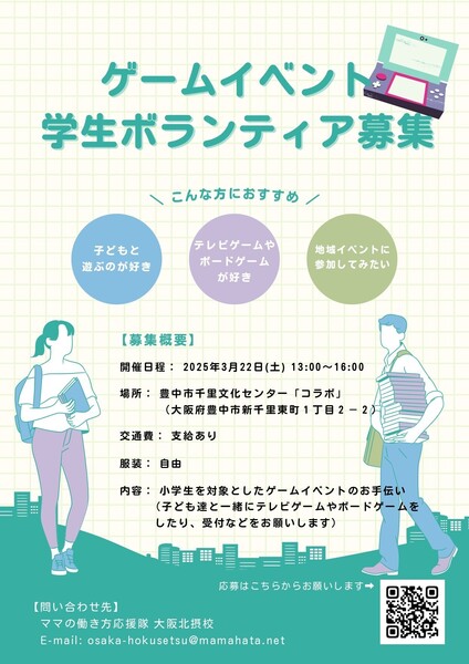 大阪府豊中市で開催される小学生向けのゲームイベントの学生ボランティアを募集します。子どもと一緒にテレビゲームやボードゲームをしたり、受付などをお願いします。当日の会場までの交通費は支給いたします。