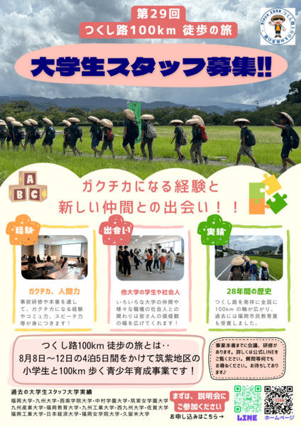1998年から始まり、今年で28年目になりました!地域の子どもたちを自分たちの手で成長させていくことを第一に取り組み活動を続け、福岡発祥のこの事業も、いまでは全国10ヶ所以上に広がっています。子どもたちだけではなく、私たちもたくさんのことを経験していく中で大切な力を手に入れていきます!ぜひ一緒に助け合い、高め合い、そして歩いていきましょう!