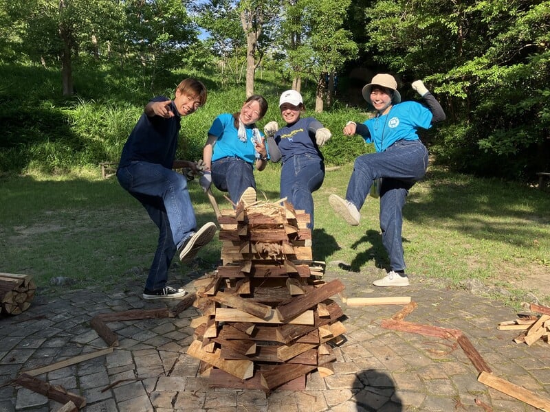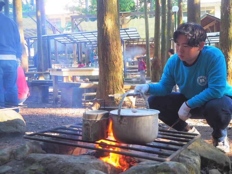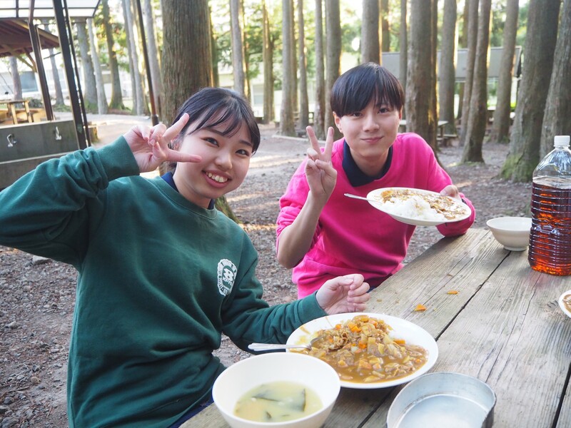 ■はじめてでとても緊張していたけど、先輩リーダーのおかげでバスのレクリエーションや色々なプログラムを楽しむことができ、緊張も段々とほぐれていきました。野外炊飯では、小学生ぶりに火おこしをして、みんなでカレーを作る体験をしました。普段は体験できないキャンプらしいことができて楽しかったです。(大阪常磐会大学)