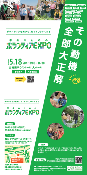 【5/18(日)大阪】ボランティアをやってみたい、という学生の皆さんにピッタリのイベント「学生のためのボランティアEXPO」を開催。関西の20団体が集結します。