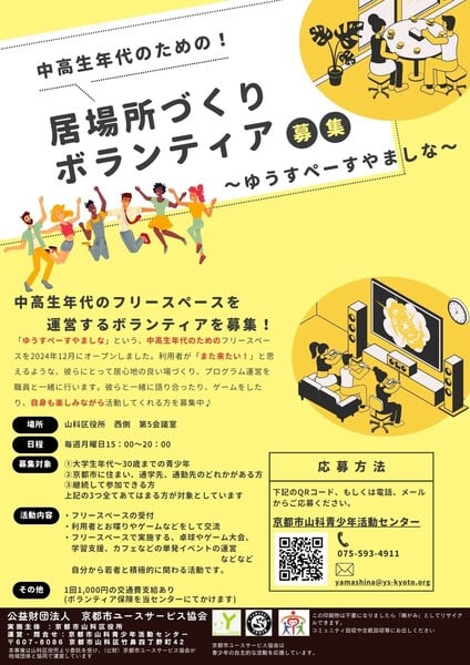 - 【山科区】中高生たちのフリースペース運営ボランティア募集【毎週月曜日】