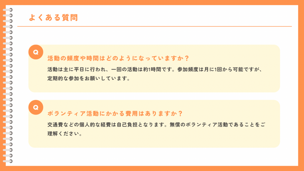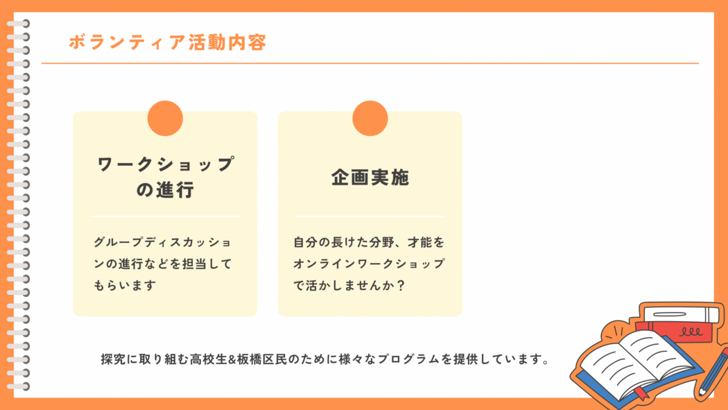 コミュニケーション能力、タイムマネジメント能力が身につき、みなさんが大きくなってからも会議や、プレゼンで役に立つ力なのでぜひボランティアで鍛えてみて下さい。