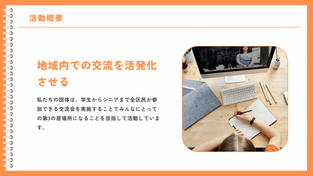 そんな時に、災害が起きた時には助け合う仲間になるかもしれない、何か新しい事を始める仲間になるかもしれない同じ区の人たちと交流し、お互いのことを知る機会を作りたいと思い団体を設立しました