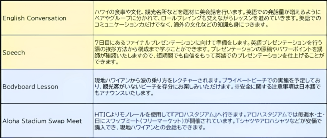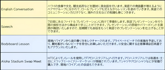 A2:最終日のプレゼンテーション1名3分の時間が与えられています。プレゼンテーションのテーマについては、出発前の事前指導の際に決定し、各自出発前にリサーチを進めていただきます。日本で準備したものを参考にして、ハワイで体験した事柄を結び付けプレゼンに臨みます。たとえ人前での発表やスピーキングが苦手であっても、スピーチの授業でサポートを受けることができます。
