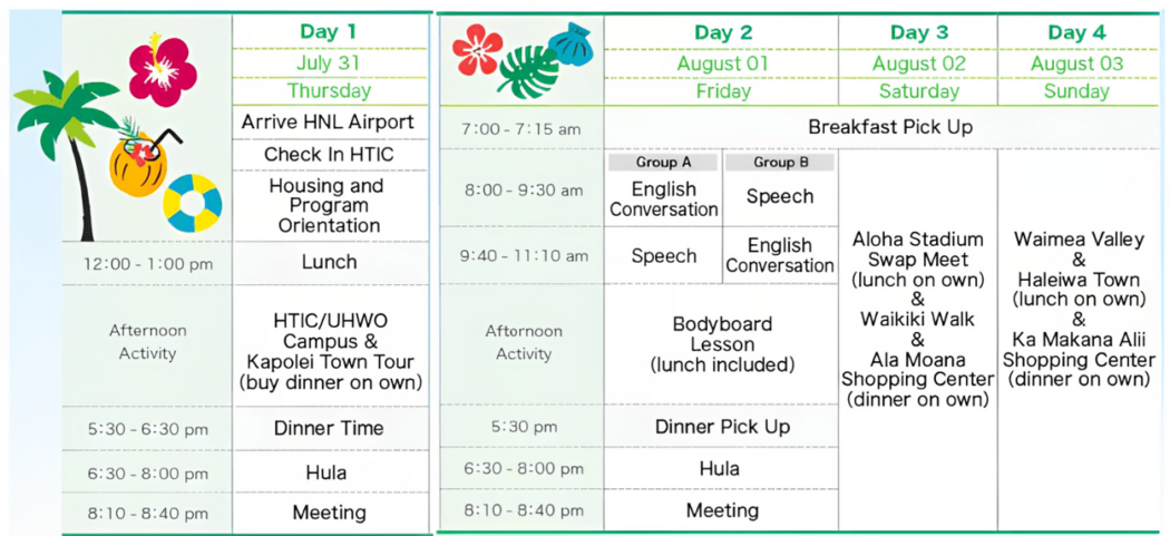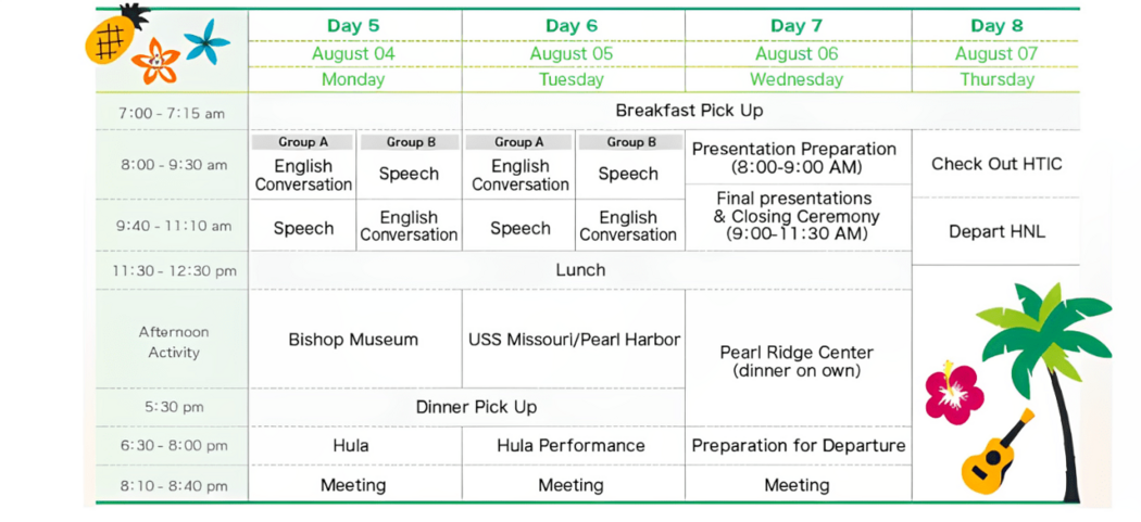 A8:HTICの卒業生・在校生、隣接するハワイ大学ウエストオアフ校の卒業生・在校生、ハワイの大学に通う学生などが担当します。アクティビティの際、生徒たちを案内する役割のスタッフで、中高生たちとうまくコミュニケーションがとれるシャペロンに依頼しています。