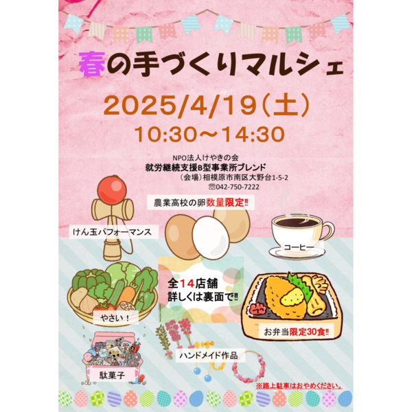 第6回「春の手づくりマルシェ」を開催します!障害者施設や一般作家さんの手作り品、農業高校の卵、お菓子、お弁当などの販売します。地域の人が集うイベントを一緒に盛り上げて楽しい時間を作りましょう!