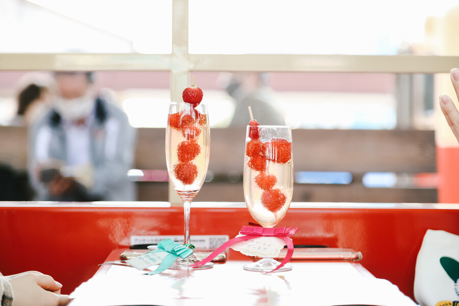 ウェルカムドリンクとして、はたサポ特製の「市原シャンパン」をご提供します!市原特産の梨と、市内の農家さんが育てたイチゴを一緒に味わえるノンアルドリンクで乾杯したら、トロッコは出発します!