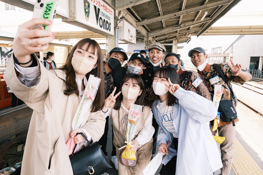 五井駅を出発し30~40分すると、最初の停車駅・上総牛久駅に到着。この駅では、地元の商店街の皆さんによる「出張牛久商店街」がお出迎え!