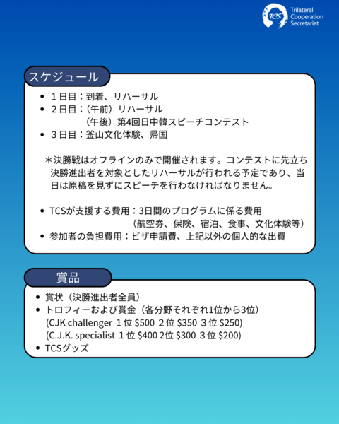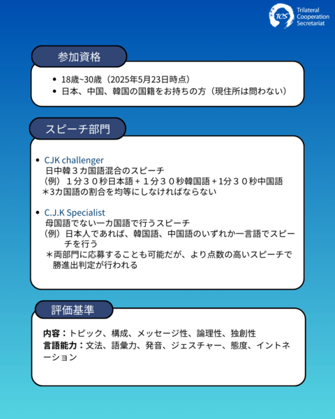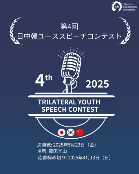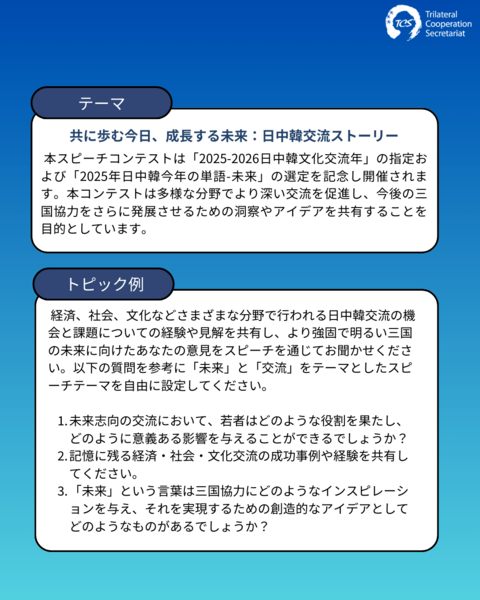 本スピーチコンテストは「2025-2026日中韓文化交流年」の指定および「2025年日中韓今年の単語-未来」の選定を記念し開催されます。本コンテストは多様な分野でより深い交流を促進し、今後の三国協力をさらに発展させるための洞察やアイデアを共有することを目的としています。