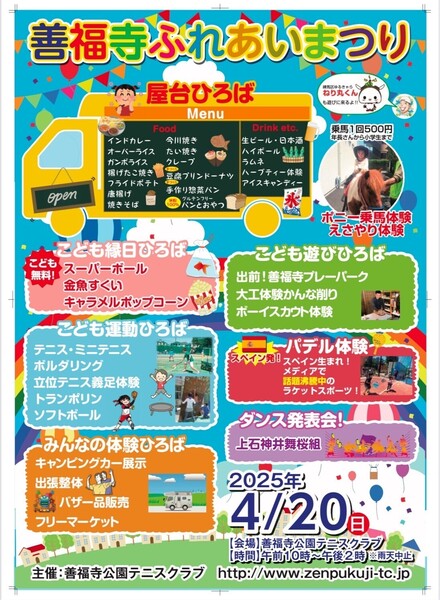 善福寺ふれあいまつりでは、ミニテニス、ボルダリング、立位テニス義足体験、トランポリン、金魚すくい、スーパーボールすくい、キャラメルポップコーン、ポニー乗馬体験、駐車場駐輪場係など、ご来場の皆様が笑顔になれるような様々なエリアをご用意しています。