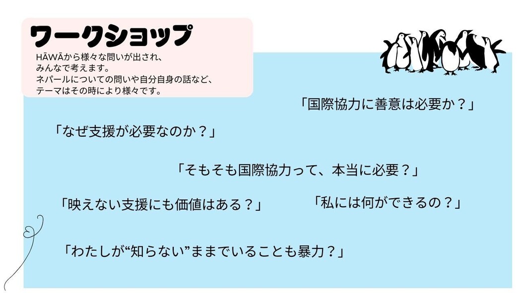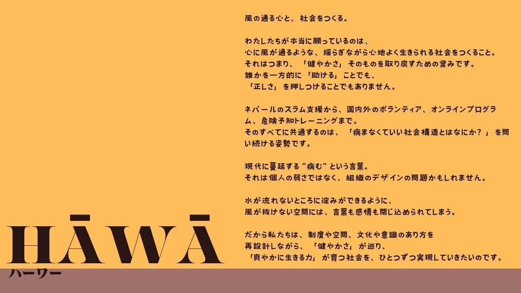 HĀWĀは、ネパールと日本を拠点に、教育・福祉・働き方の現場で"風通しのよさ"を追求する国際協力団体です。スラムの放課後教室や海外ボランティアプログラム、国内での若者支援や企業研修など、枠にとらわれない形で「生きづらさ」に向き合い、誰もが健やかに生きられる社会づくりを目指しています。