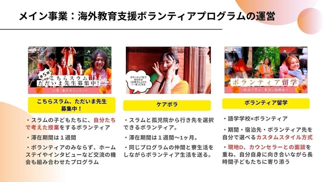 - 海外ボランティア派遣:大学生や若者向けに、短期〜長期の派遣プログラムを提供