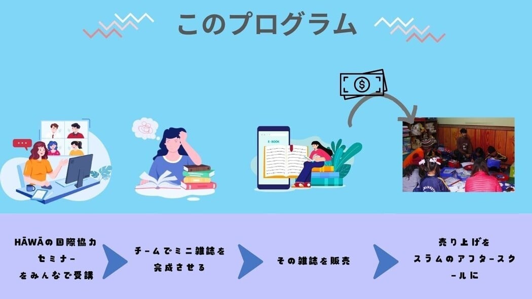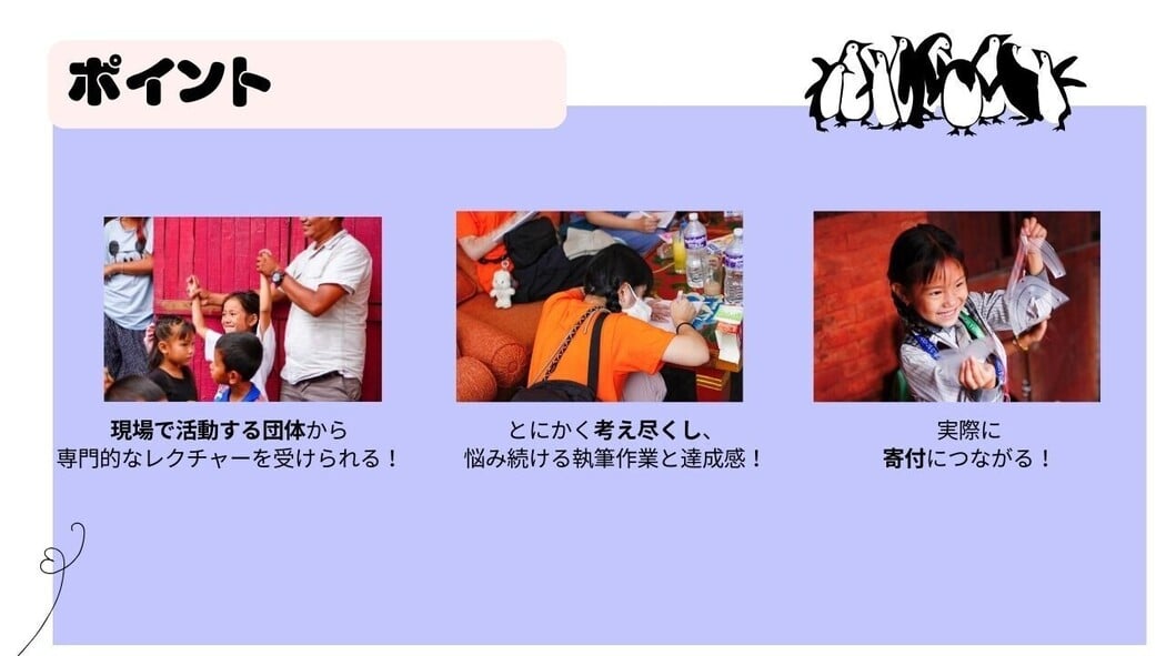 専門的な国際協力セミナーとワークショップ、冊子作成と寄付がセットになった完全オンラインプログラムです!ネパールでアフタースクールを運営する団体からの現場目線のレクチャーと、チームでの冊子作りがポイント