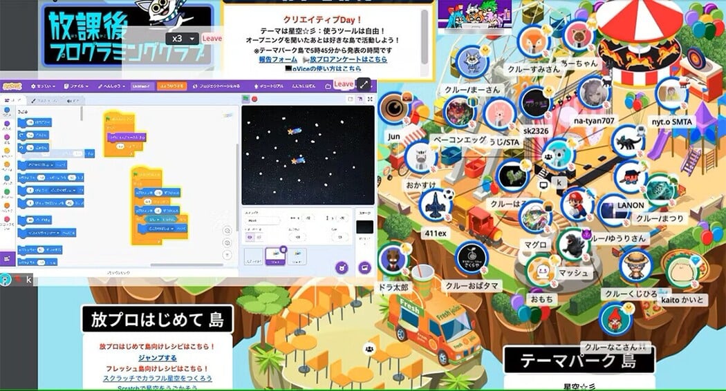 バーチャル空間でプログラミングやMinecraft、アート、音楽などデジタル作品づくりを子ども同士で学び合う無料のオンラインクラブ