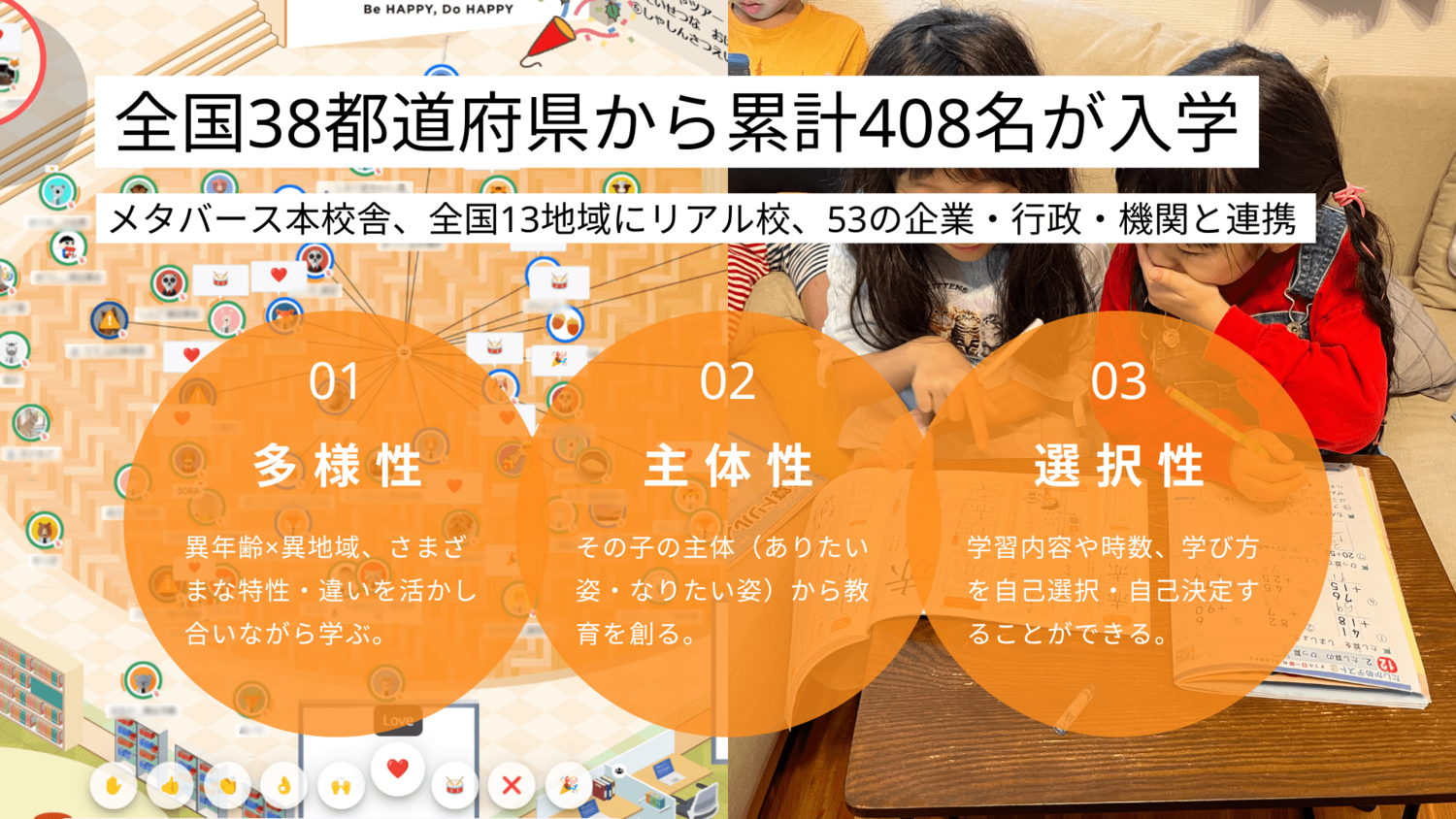 現時点で全国38都道府県から408名の小中学生が入学し、メタバースを本校舎としながら全国13地域に教室を開校、42の企業・自治体・機関と連携しながら学校を運営しています。