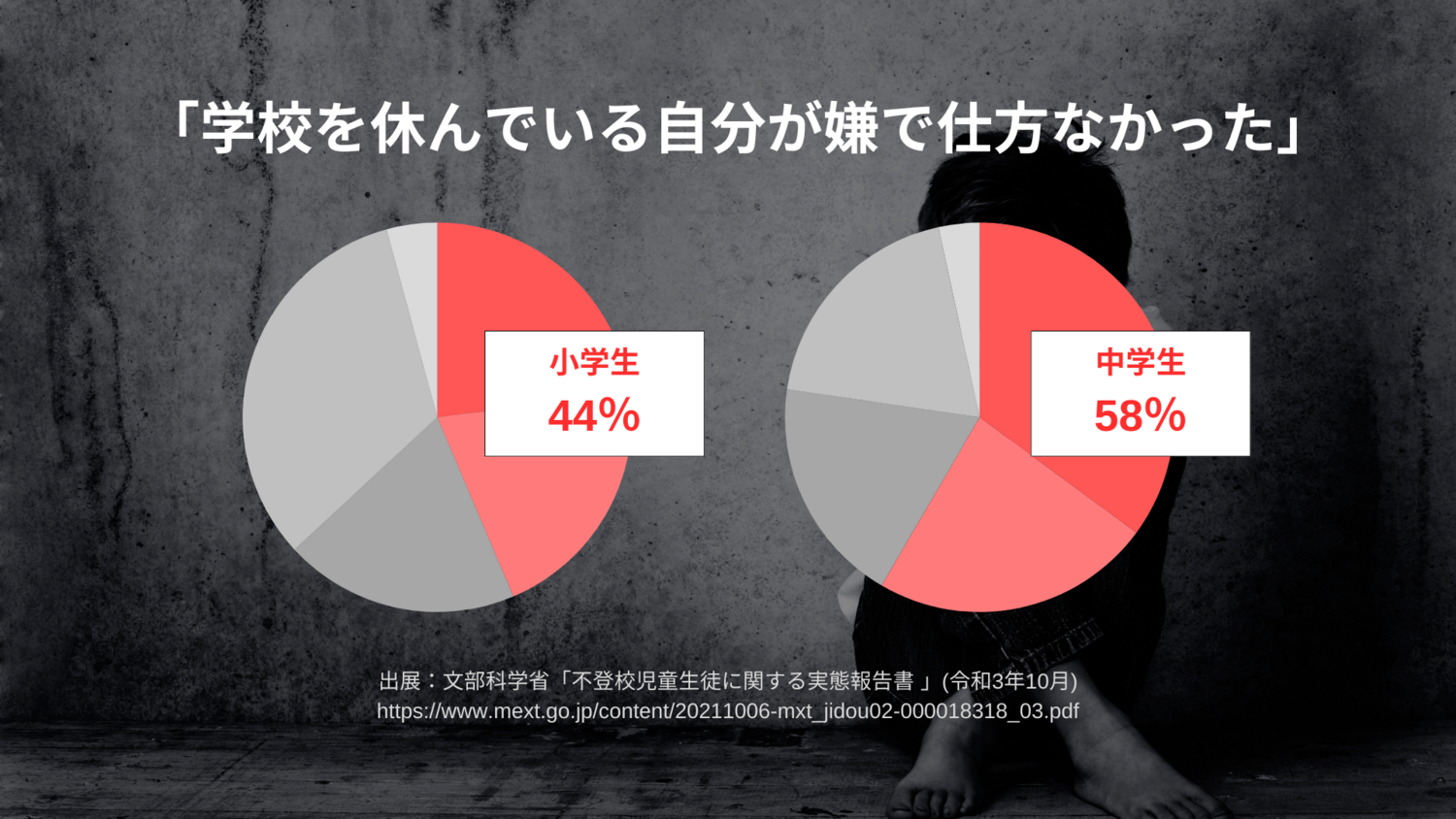 不登校はネガティブな言葉で語られることが多く、事実、半数の小中学生が不登校をきっかけに自己肯定感をさげ、生きる希望を失う子さえいます。