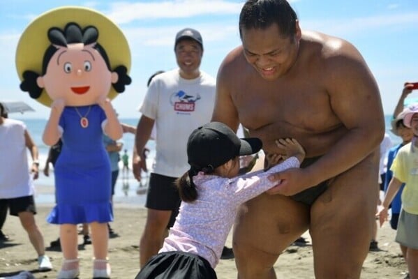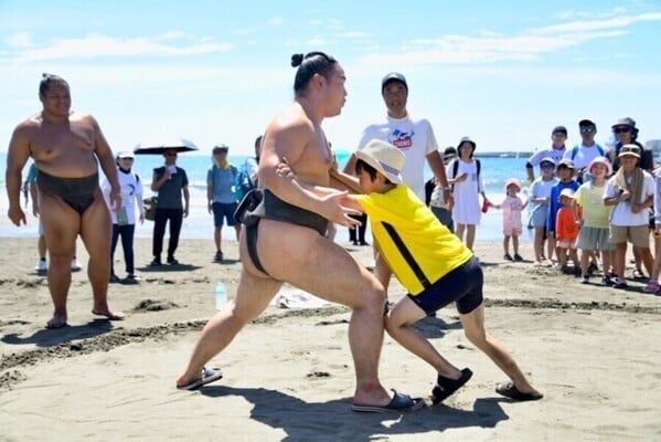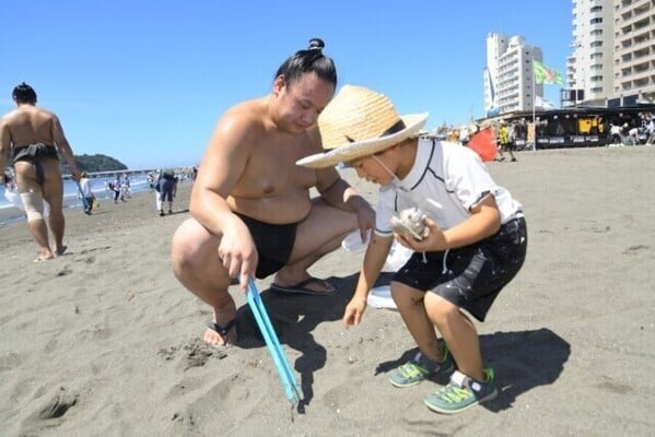 ごみ拾いをしてきれいになった砂浜で土俵を作り、現役のお相撲さんと相撲がとれちゃうごみ拾い!