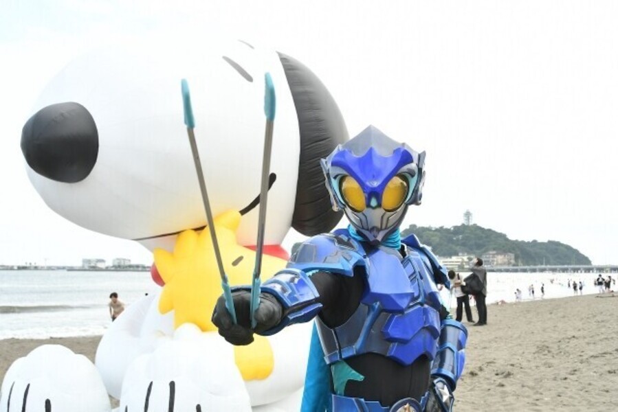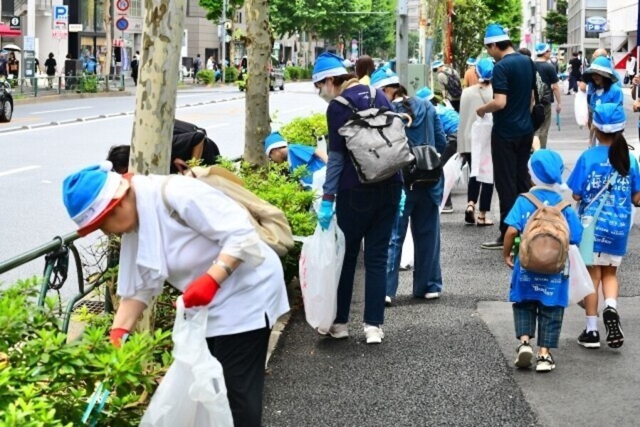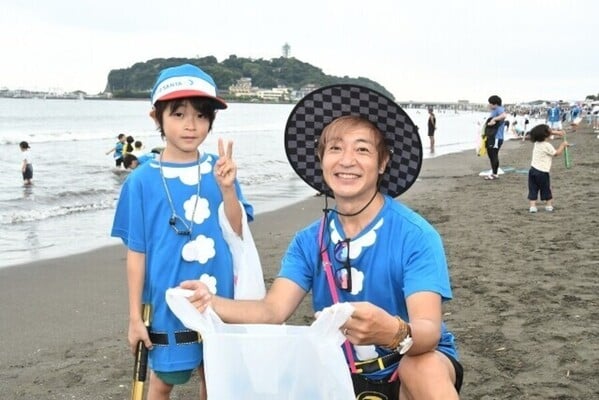 海の恩恵に感謝する海の日に青いサンタクロースの格好をして、未来の子どもたちにきれいな海をプレゼントするというコンセプトのごみ拾い