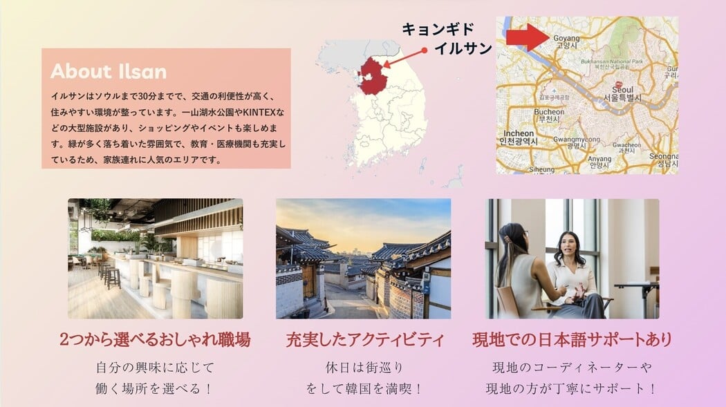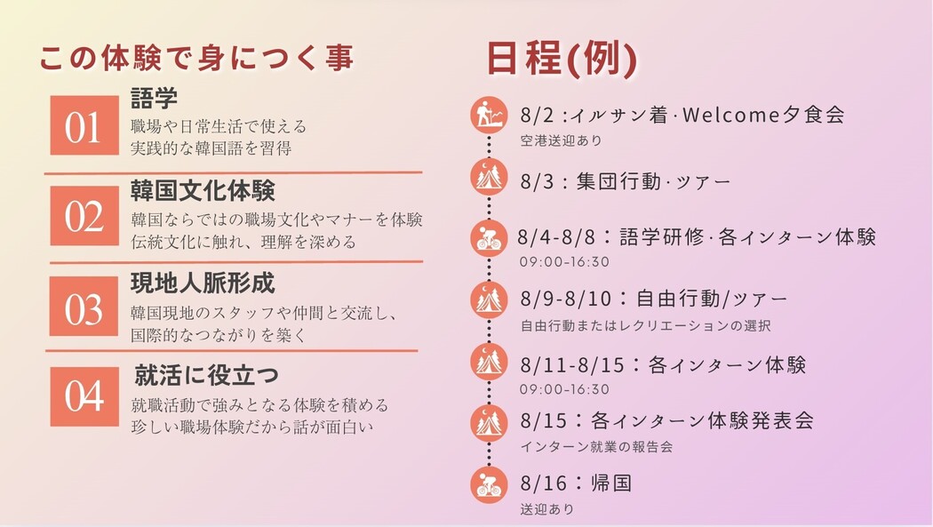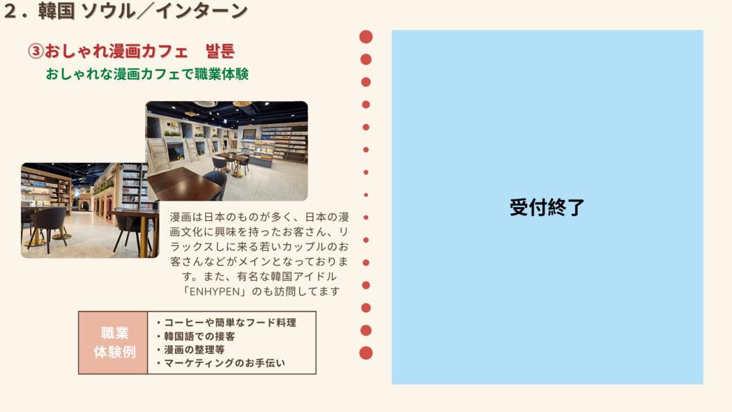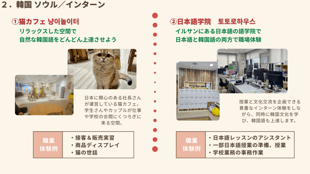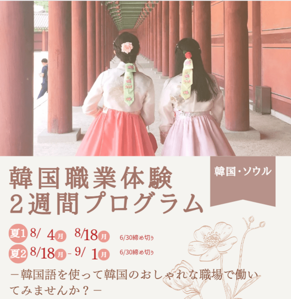 韓国でリアルな職場を体験し、グローバルな視野を広げる2週間!韓国の方々と韓国語で交流しつつ、憧れの業界で学び、働きながら、自分の可能性を発見しよう。(K-POP音楽レッスン・日韓言語交流会あり)