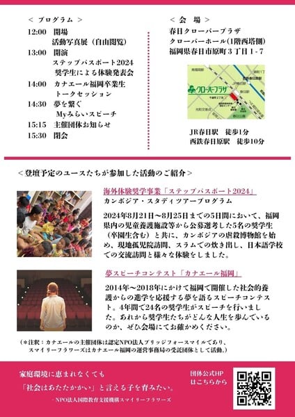 児童養護施設を退所した後、専門学校や大学等へ進学する子どもたちを支援する(返済不要の)奨学金支援プログラムとしてNPO法人ブリッジフォースマイルが創設・運営していた「カナエール」の福岡事務局として活動を展開。